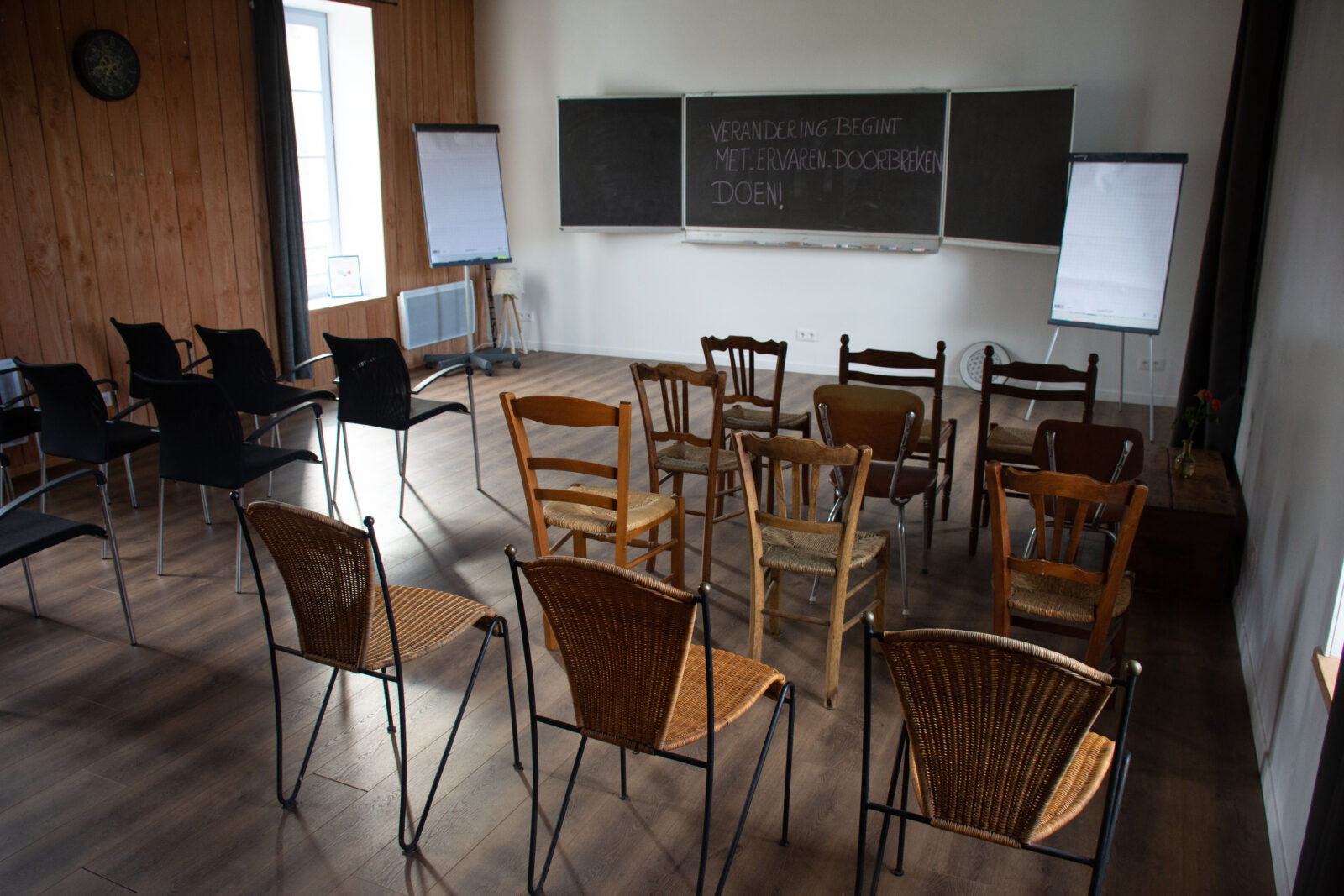Trainingsruimte met beamer, flipover en authentiek schoolbord voor workshops of coaching